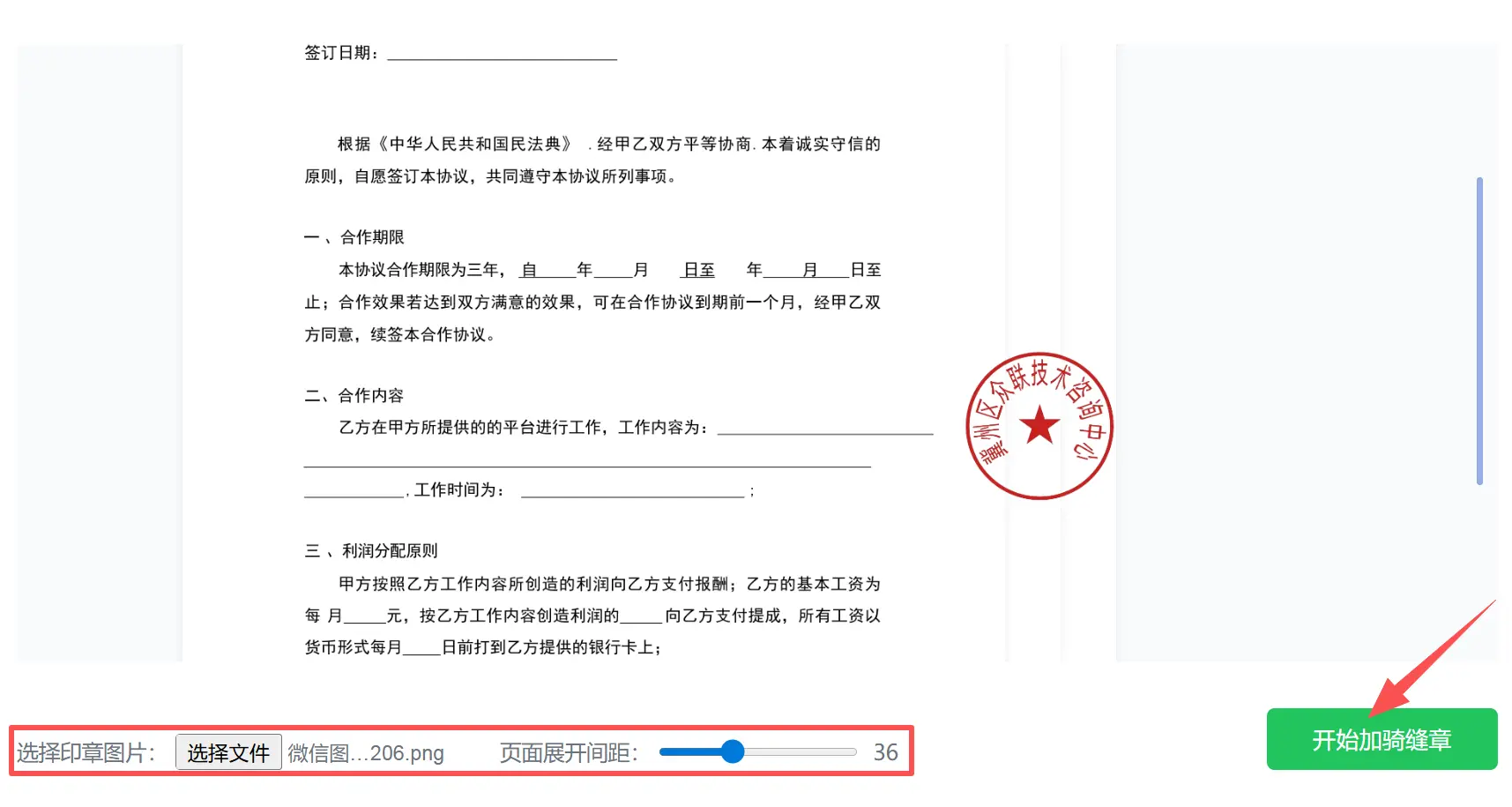 第3步:文件上传成功后选择要添加的印章,然后调整印章大小和位置,确定等待即可。