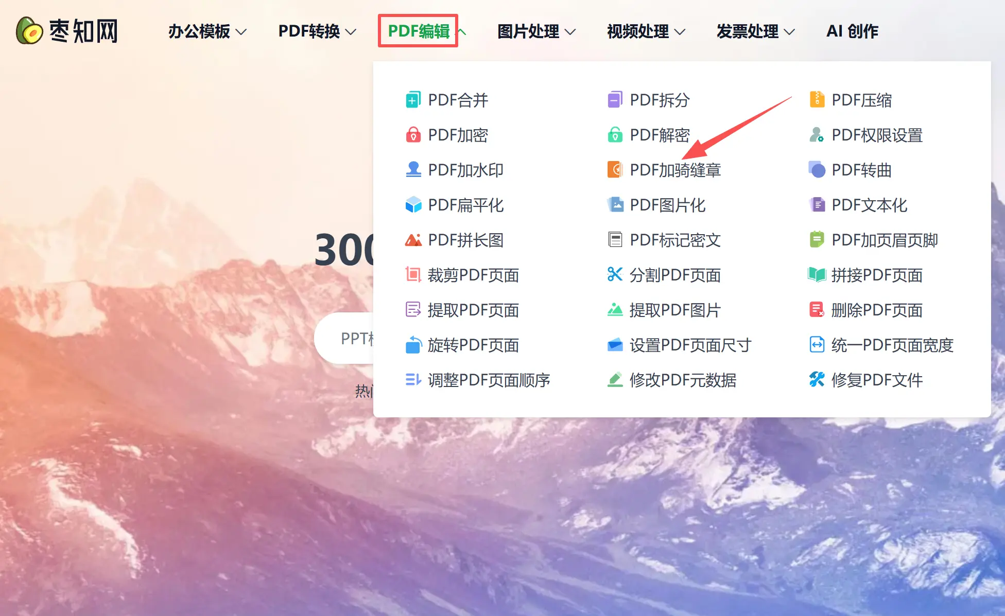 第1步:用浏览器打开枣知网(https://www.51zaozhi.com/),点击导航栏中的PDF编辑,找到PDF加骑缝章。