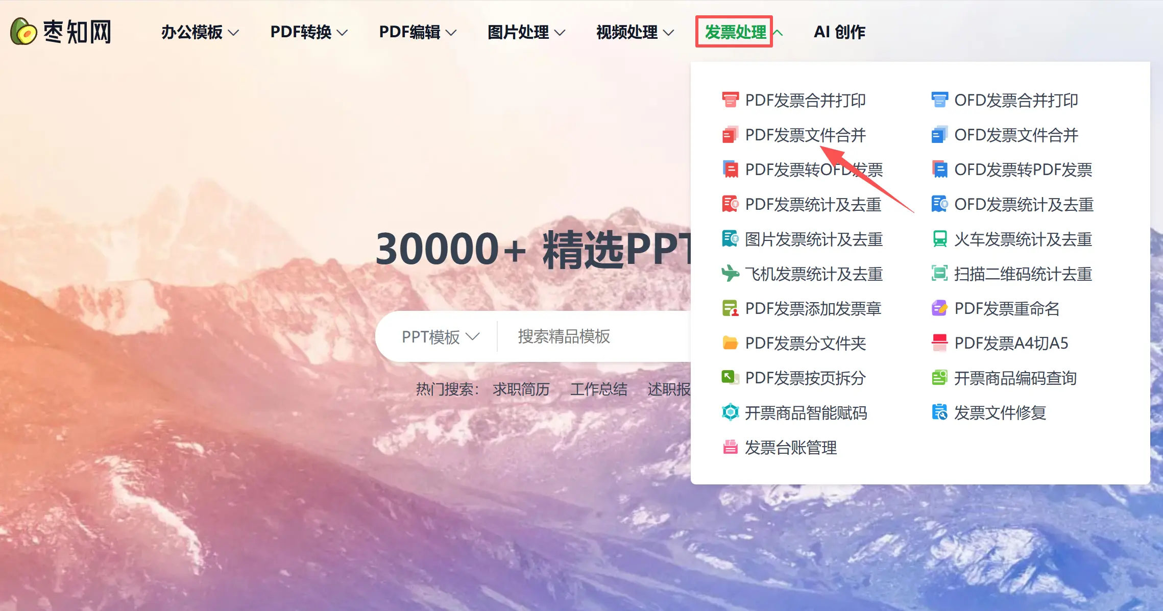 1.浏览器打开枣知网(https://www.51zaozhi.com/),点击导航栏里的发票处理,找到PDF发票文件合并。